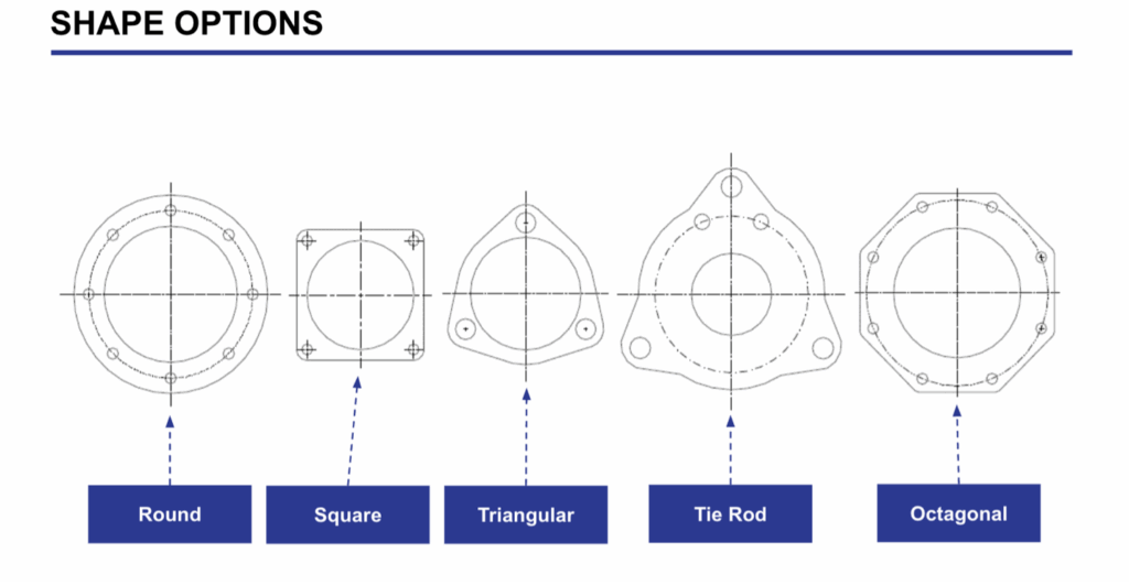 | Square | Square profile with bolt holes at the corners; useful when attaching to square equipment or non-round pipe systems. | Pumps, valves, custom fabrications. |